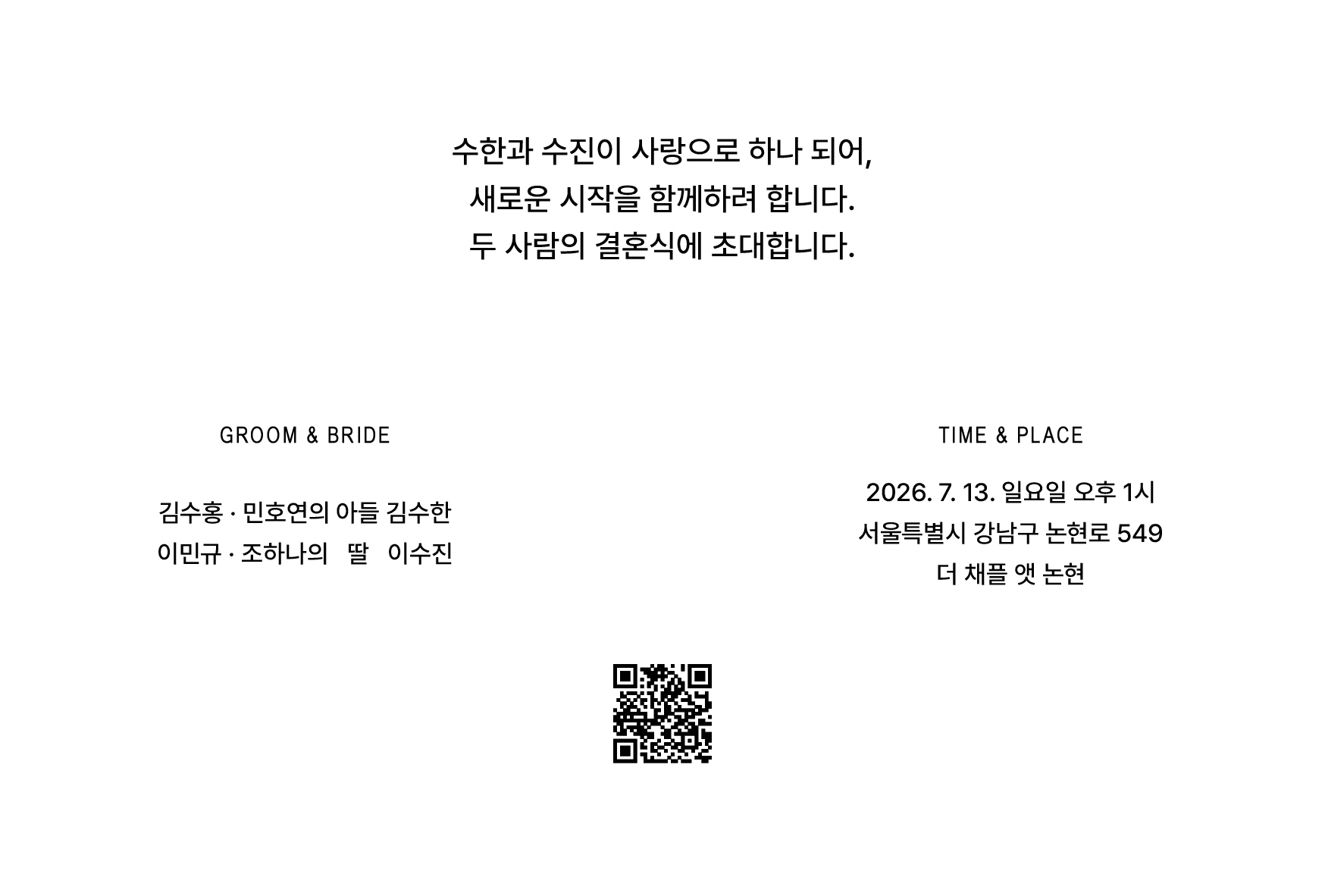 필요한 정보만 깔끔하게 담은 엽서형 청첩장 입니다.