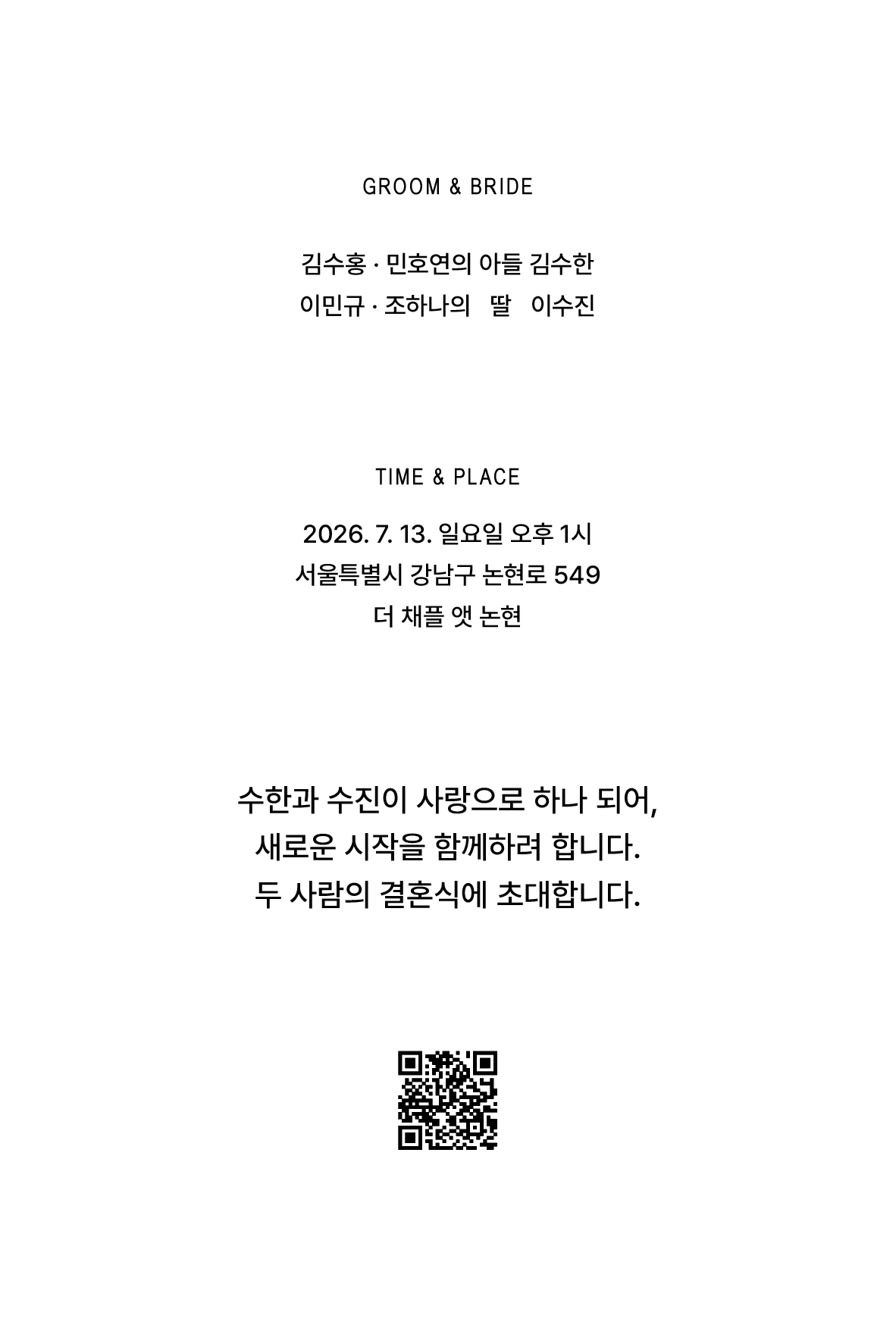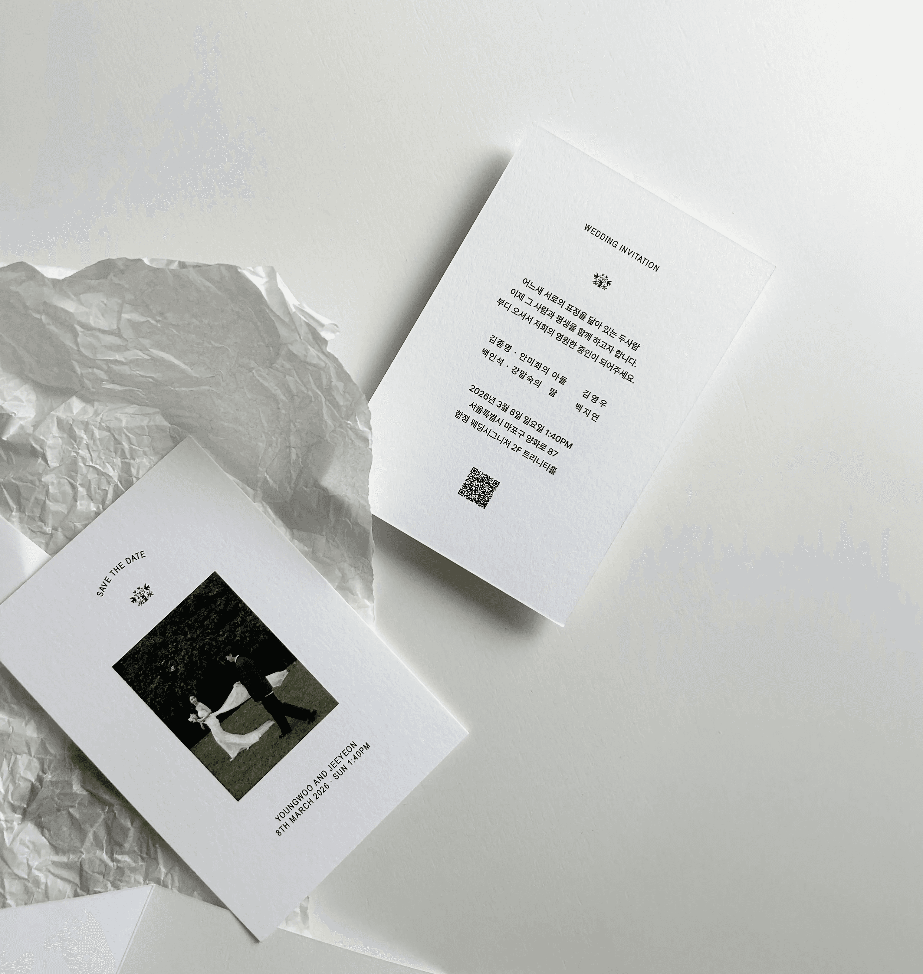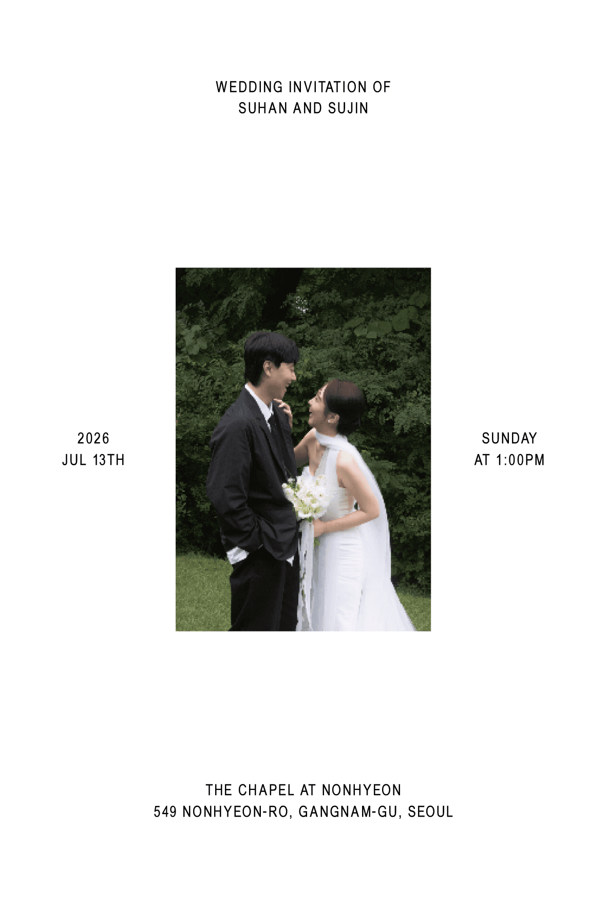 필요한 정보만 깔끔하게 담은 엽서형 청첩장 입니다.